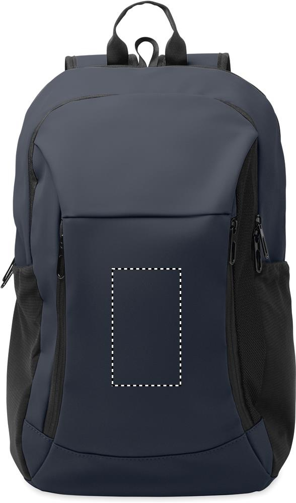 15'' Laptop-Rucksack aus softem PU mit gepolstertem Rücken und verstecktem Hauptfach mit Reißverschluss. Reißverschlusstasche auf der Vorderseite, 2 seitliche Fronttaschen mit Reißverschluss und 2 seitliche Netztaschen. Mit 210D RPET-Futter.