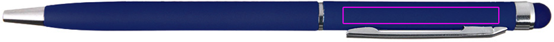 Edelstahl-Kugelschreiber mit blauschreibender Kunststoff-Mine und farblich passender Touch-Funktion oberhalb des Clips. Ihre Werbung gravieren wir unterhalb des Clips.