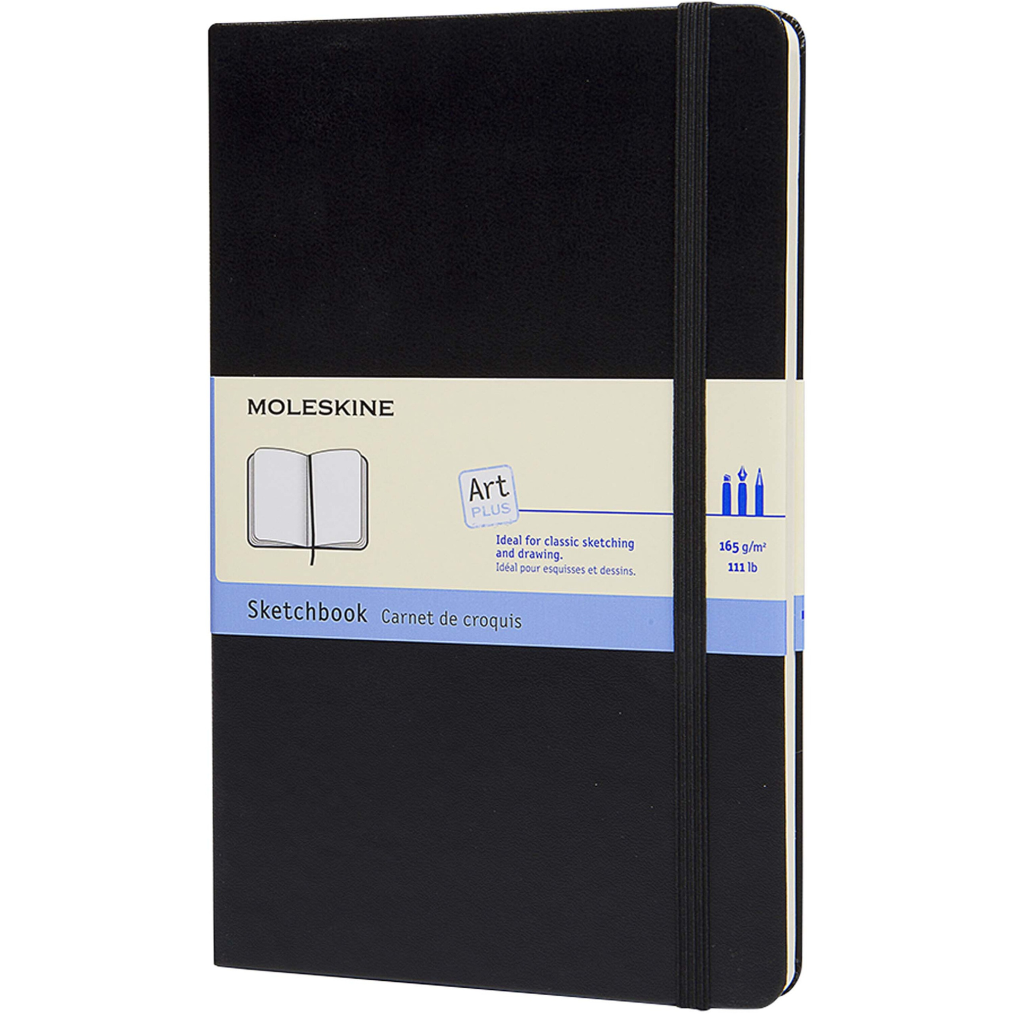Das Large Moleskine Skizzenbuch ist in Karton gebunden, hat einen abgerundeten Einband und besteht aus hochwertigem, säurefreiem Papier. Das Skizzenbuch ist mit einem Lesezeichen, einem elastischen Verschluss und einer ausziehbaren Innentasche ausgestattet, die die Geschichte von Moleskine festhält.