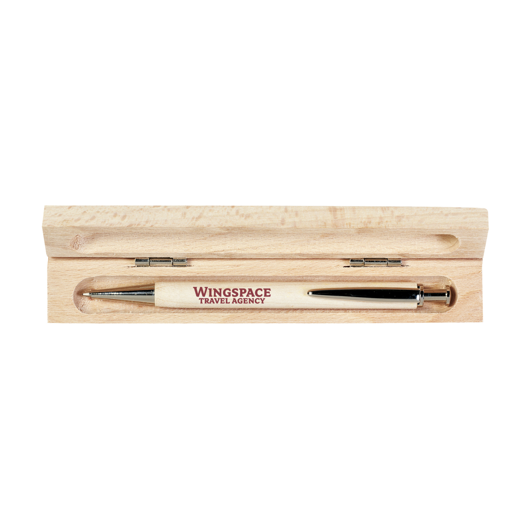 WoW! Blauschreibender Kugelschreiber aus Buchenholz mit verchromtem Clip, Druckknopf und Spitze. In einem Buchenholzetui.