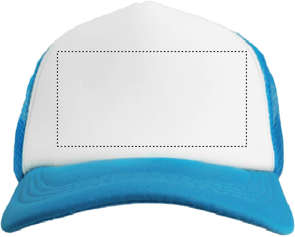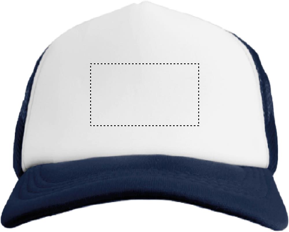Trucker Kappe. 5 Panele. 140-150 gr/m2 Polyester. Verstellbarer Kunststoffverschluss. Weißes Frontpanel, farbiger Kappenschirm aus Polyester Jersey mit Schaum-Verstärkung. Weitere Panele aus Mesh. Größe 7 1/4.