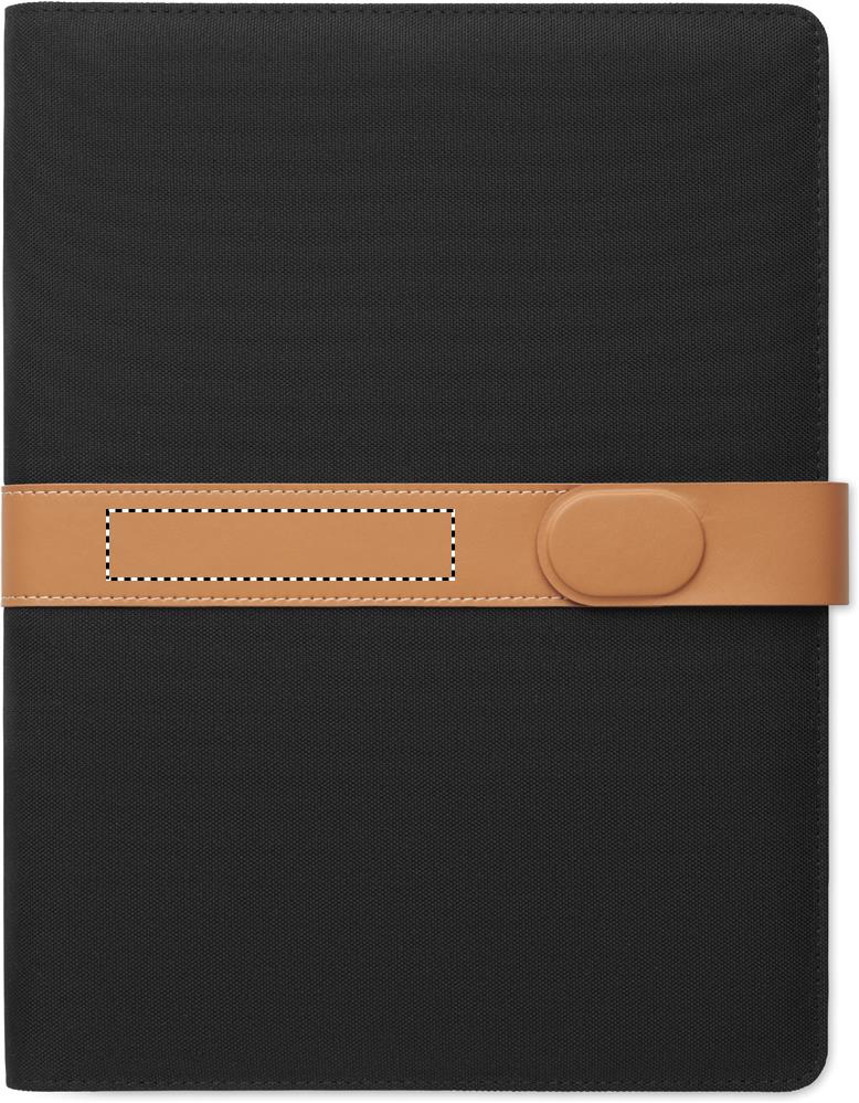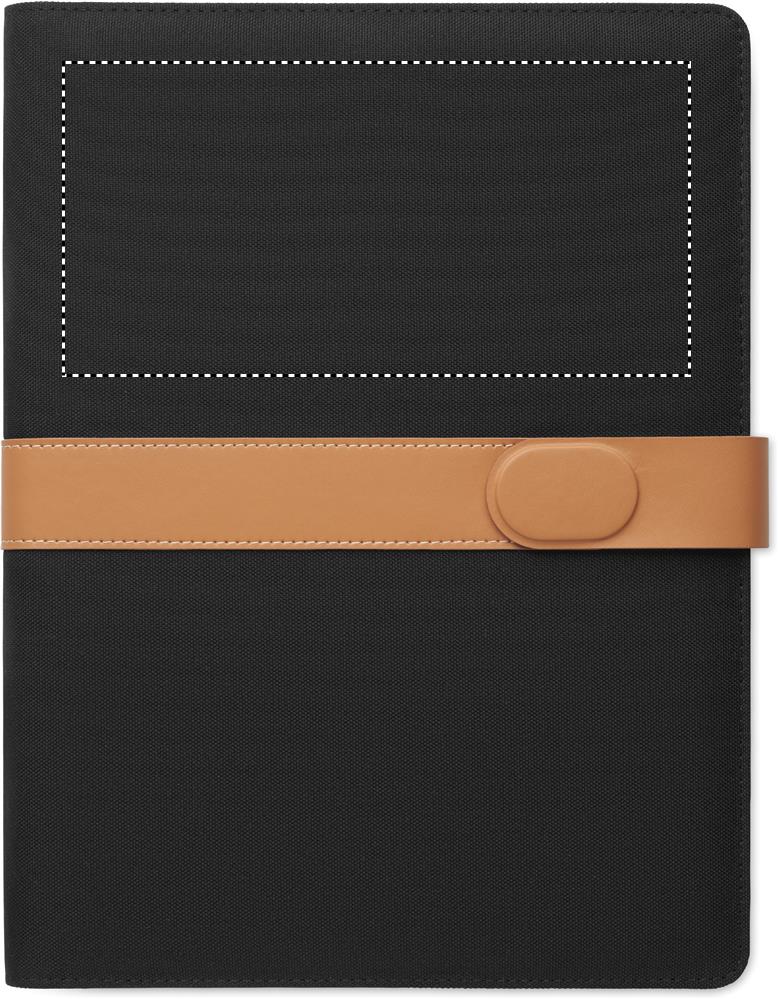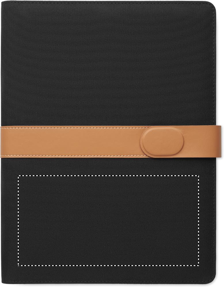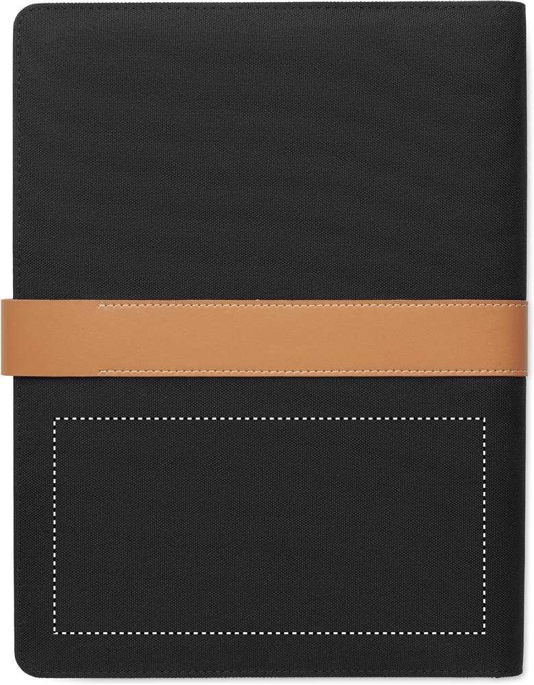 A4 portfolio in RPET with faux leather details. Replaceable A4 notepad.30 recycled paper lined pages. Pen holder. 4 cardholders, 3 small pockets and one big compartment. Magnetic strap closure.