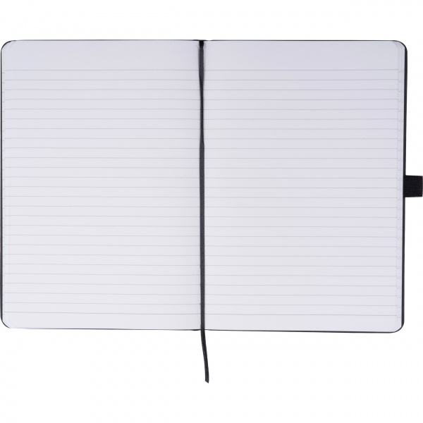 A5 notebook with a PU cover, bookmark, elastic closure band, pen loop, and 120 lined pages made of stone paper. This special paper is made from calcium carbonate and is oil- and water-resistant, anti-static, non-grainy, flame-retardant, and most importantly, tear-resistant. Your logo is printed on the outside of the cover.