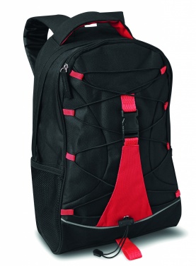 Backpack in 600D polyester with colourful contrasting facing and decorating cord on the front panel. Mesh pockets on both sides.