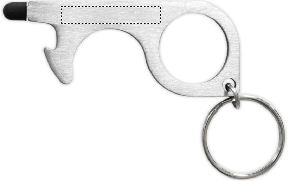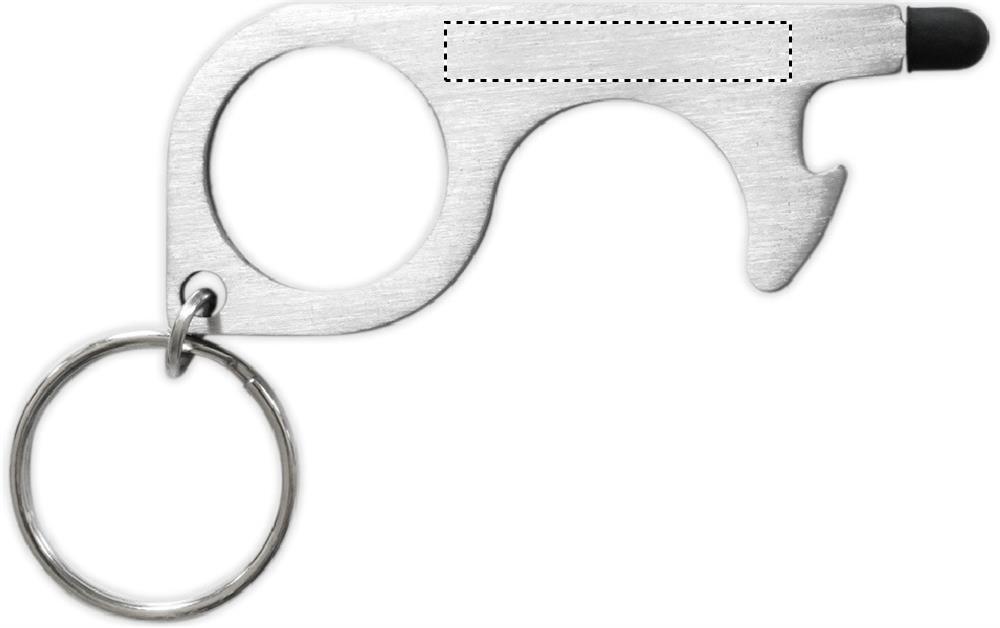 Multifunctional 5-in-1 no touch keyring. Open doors, press buttons of elevators, traffic lights, ATM`s and mobile devices without touching them. Including a bottle opener, stylus and key ring. The easy way to prevent spreading germs.