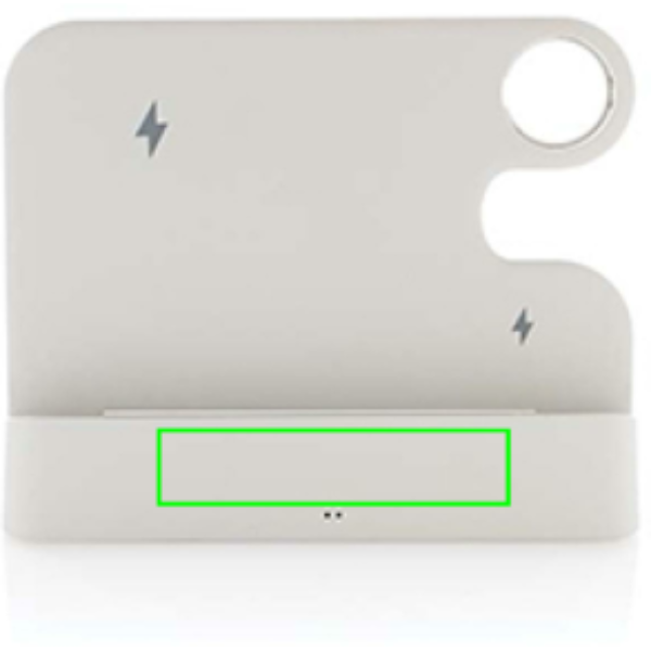 Foldable design charging stand with 15W wireless charger made with recycled ABS. With second 5W wireless charger to charge smaller objects like earbuds. With iWatch slot to fit the official charging cable for iWatch. On the backside there is a 5V/1A USB A and USB C output port to charge items by cable. With silicon tips on the bottom to avoid slipping and silicon cushioning to the stand to keep your phone in perfect condition. Total recycled content: 80% based on total item weight. RCS certification ensures a completely certified supply chain of the recycled materials. Packed in FSC® packaging. PVC Free. Including RCS recycled TPE 120cm USB A to USB C charging cable. Packed in FSC® packaging. PVC Free