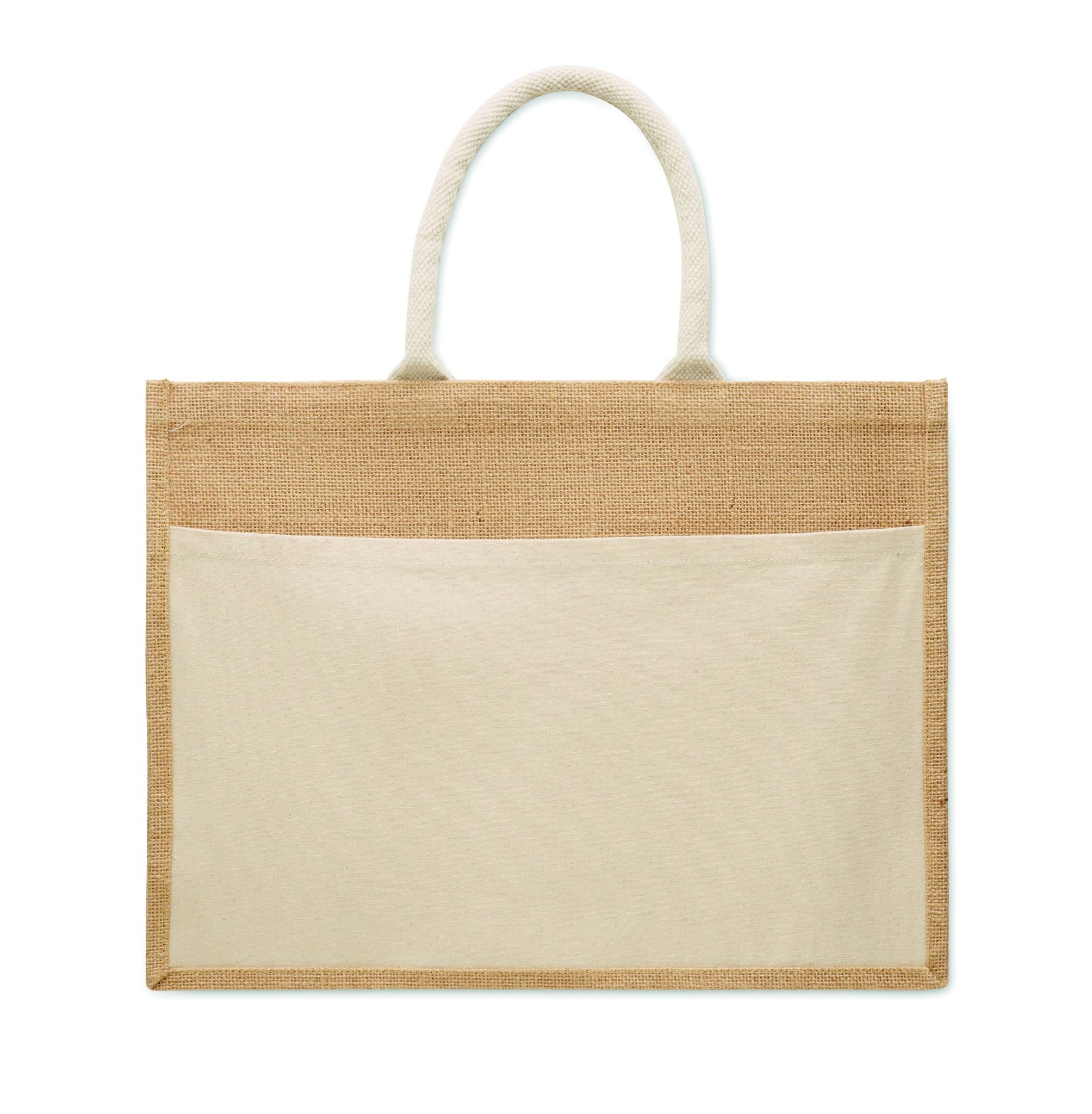 Shopping bag made of laminated jute and 280 gr/m² cotton canvas with cord handles. Includes large open front pocket.