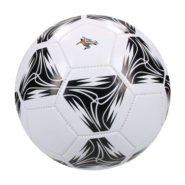 Promotional football with a sporty design. This size 5 football is made from a gloss finish PVC with 3 layers and 32 machine-sewn panels. The ball is 2mm thick, with a butyl rubber valve and latex bladder. This ball is supplied flat and will require inflating upon delivery.
