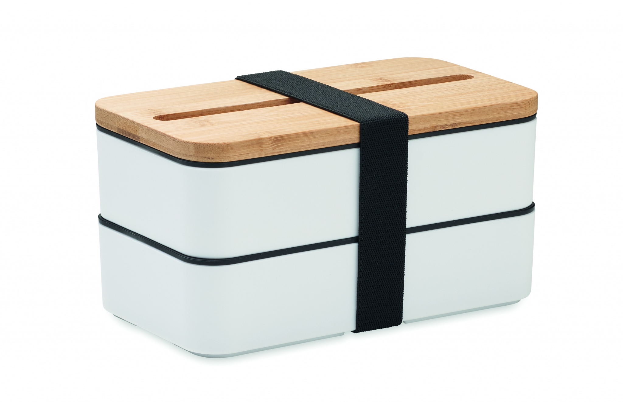 Recycled PP two-tier lunch box with removable divider and 3 cutlery utensils with attachable polyester band with bamboo lid. The lid has a phone stand functionality. Capacity: 400 ml (2x). Bamboo is a natural product, there may be slight variations in colour and size per item, which can affect the final decoration outcome.
