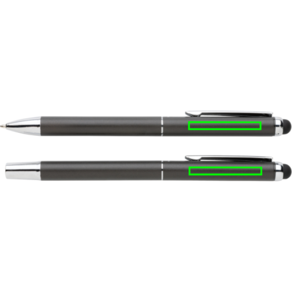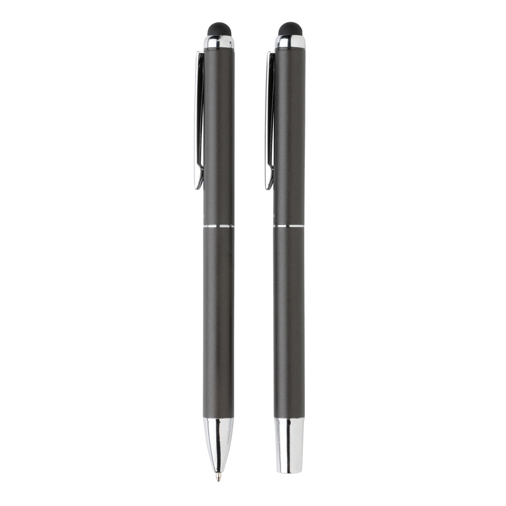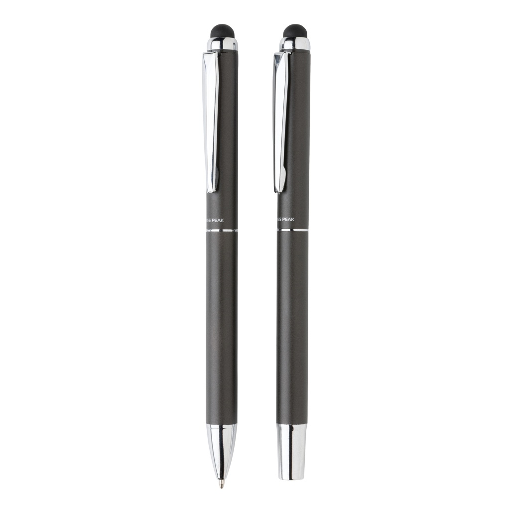This Swiss Peak deluxe pen set includes one ballpoint and one rollerball to deliver the total writing experience. Both of the items featured in this gift set feature a quality aluminium barrel and beautiful matt gunmetal finish. Each pen includes blue coloured Dokumental ink. The writing length for the pen is 1200 metre and the roller ball is 400 metre. The pen set comes in a luxury PU pouch and black gift box.