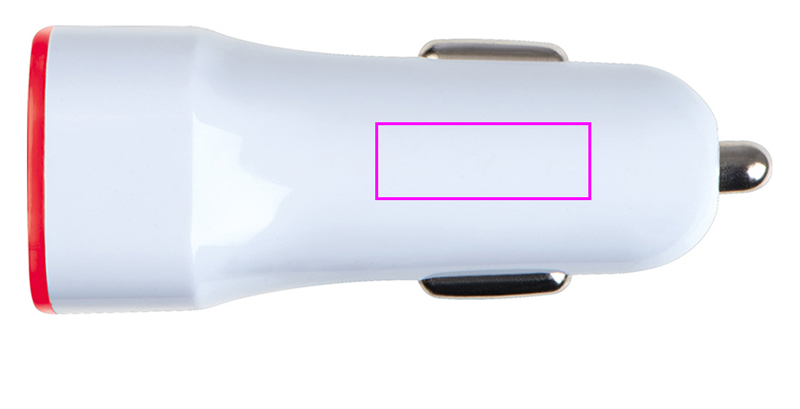 Stylish charging adapter for the 12V car socket with two slots for fast or regular charging, the color ring lights while charging. We print your logo above the ring.