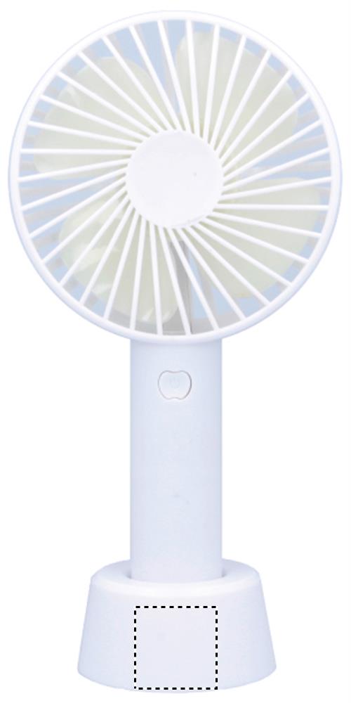 Small portable fan with additional stand to use as desk fan. 3 speed settings. USB port rechargeable battery 2000 mAh.