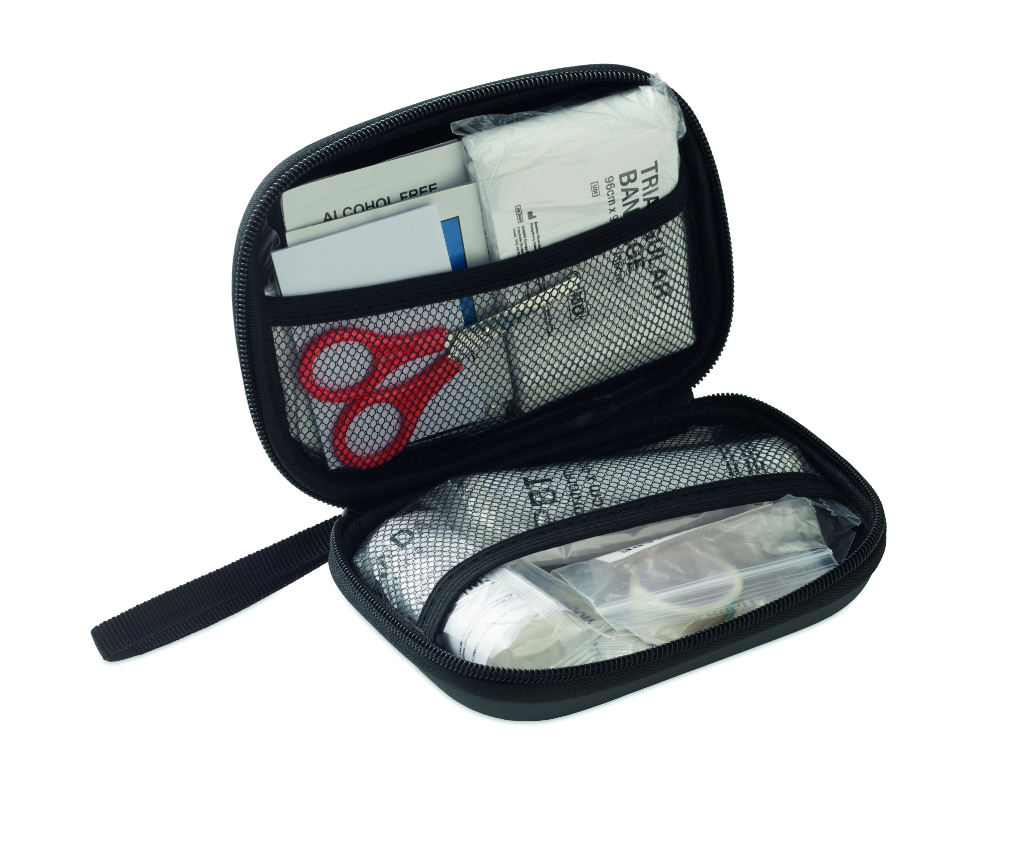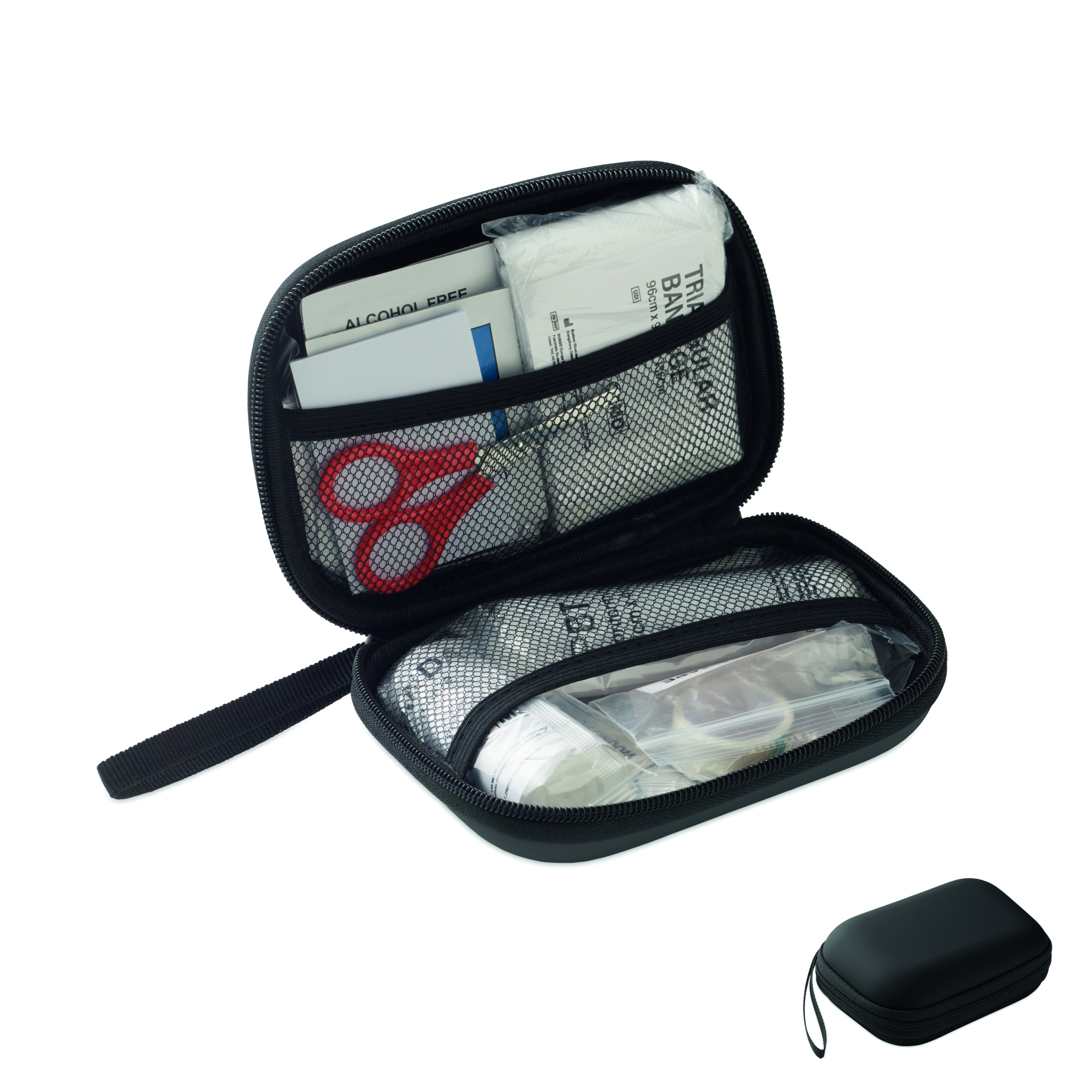 Esmaabikomplekt kõvas PU-ümbrises. Sisaldab 2 kinnast, 1 tekki, 1 teipi, 2 sidet, 1 kääre, 4 vatitupsu, 10 plaastrit ja 6 puhastuslappi. Ei ole müügil väljaspool EL-i.