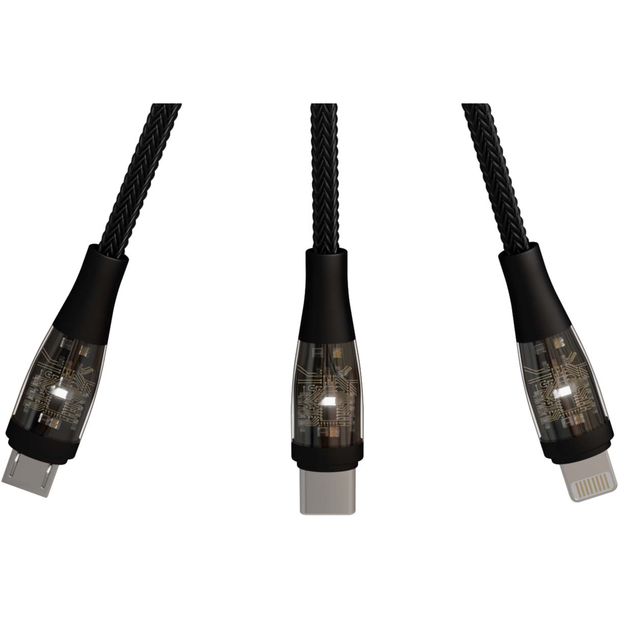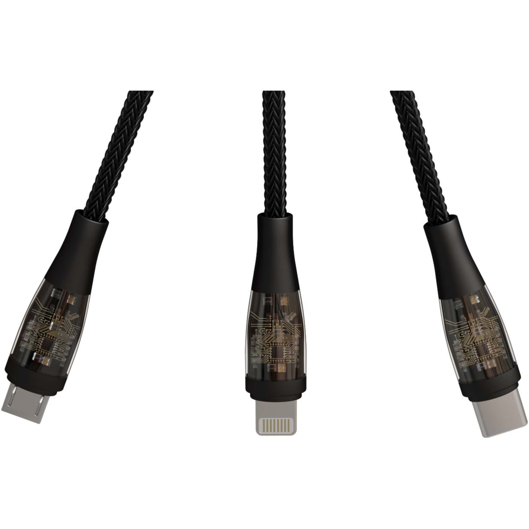 5-in-1 kiirlaadimis- ja andmeedastuskaabel. Sisend: USB-A/USB-C. Väljund: Micro USB/C-tüüp/Lightning. Kiirlaadimine: 100W/5A. Läbipaistvad pistikud. Digitaalne ekraan edastuskiirusega ees ja valgustusega logo taga.