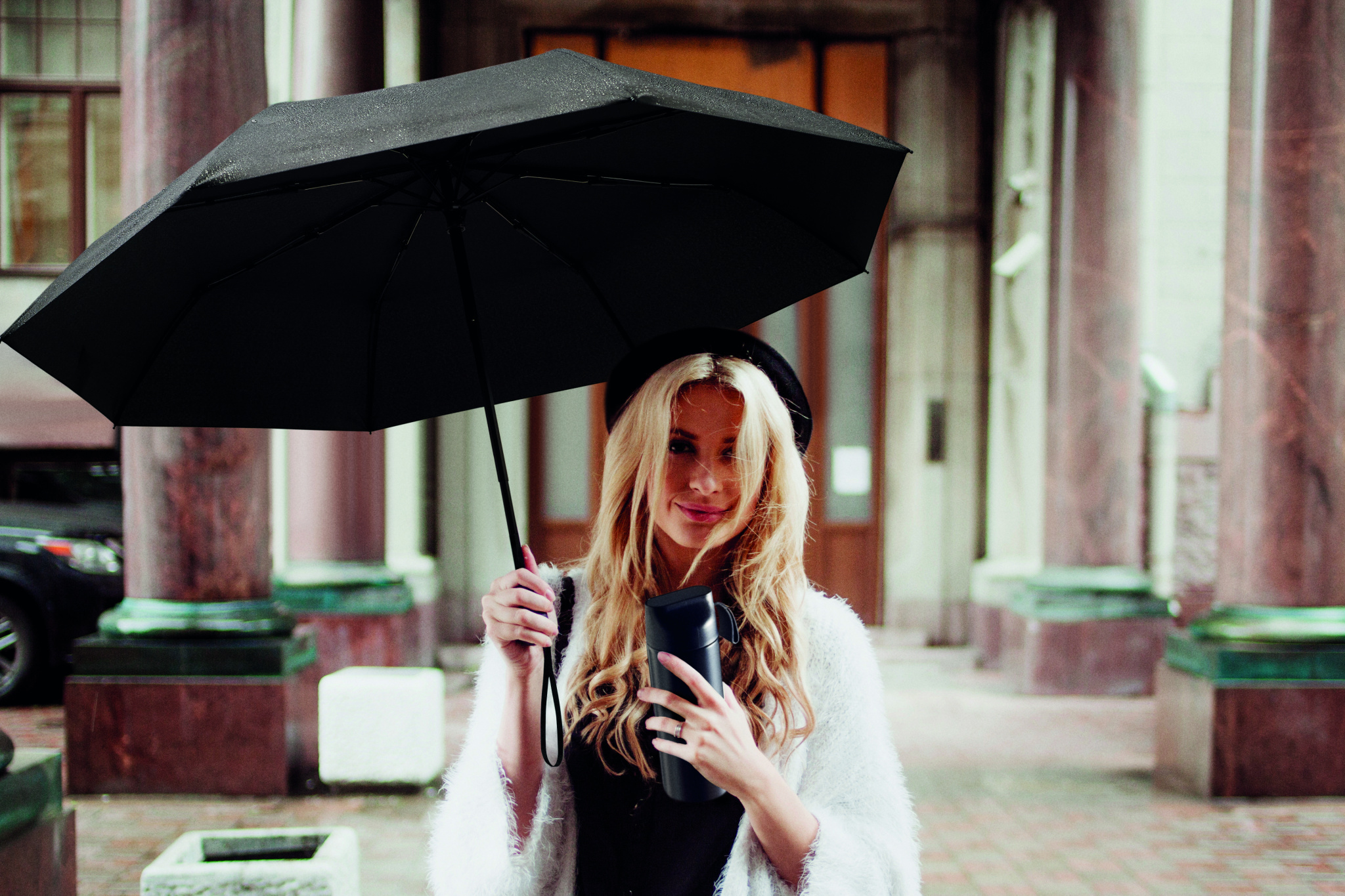 2-osainen lahjasetti: 600 ml kaksiseinäinen kierrätetty teräspullo PP-kannella, metalliyksityiskohdilla ja silikonikahvalla sekä 21'' taitettava tuulenpitävä pongeesateenvarjo ABS-kahva. Lahjarasiassa.