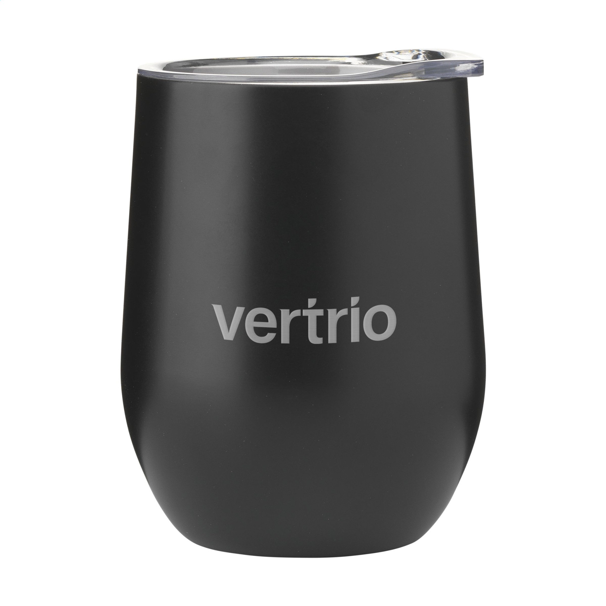 Vau! Kaksiseinäinen juomakuppi. Sisä- ja ulkoseinät on valmistettu kierrätetystä ruostumattomasta teräksestä. Tämä pitää kuumat juomat lämpiminä pidempään. Nämä kupit erottuvat välittömästi silmiinpistävän muotoilunsa ja kauniin mattapinnan ansiosta. Läpinäkyvässä muovisessa push-on kannessa on lukittava juoma-aukko. Tilavuus 350 ml. RCS-sertifioitu. Kierrätysmateriaali yhteensä: 83 %. Jokainen tuote toimitetaan erillisessä ruskeassa pahvilaatikossa.