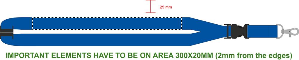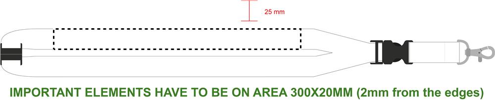 25 mm kaulanauha papukaijalukolla, pistosoljella ja turvalukolla. Sublimaatiopainatus ainoastaan valkoiseen tuotteeseen.