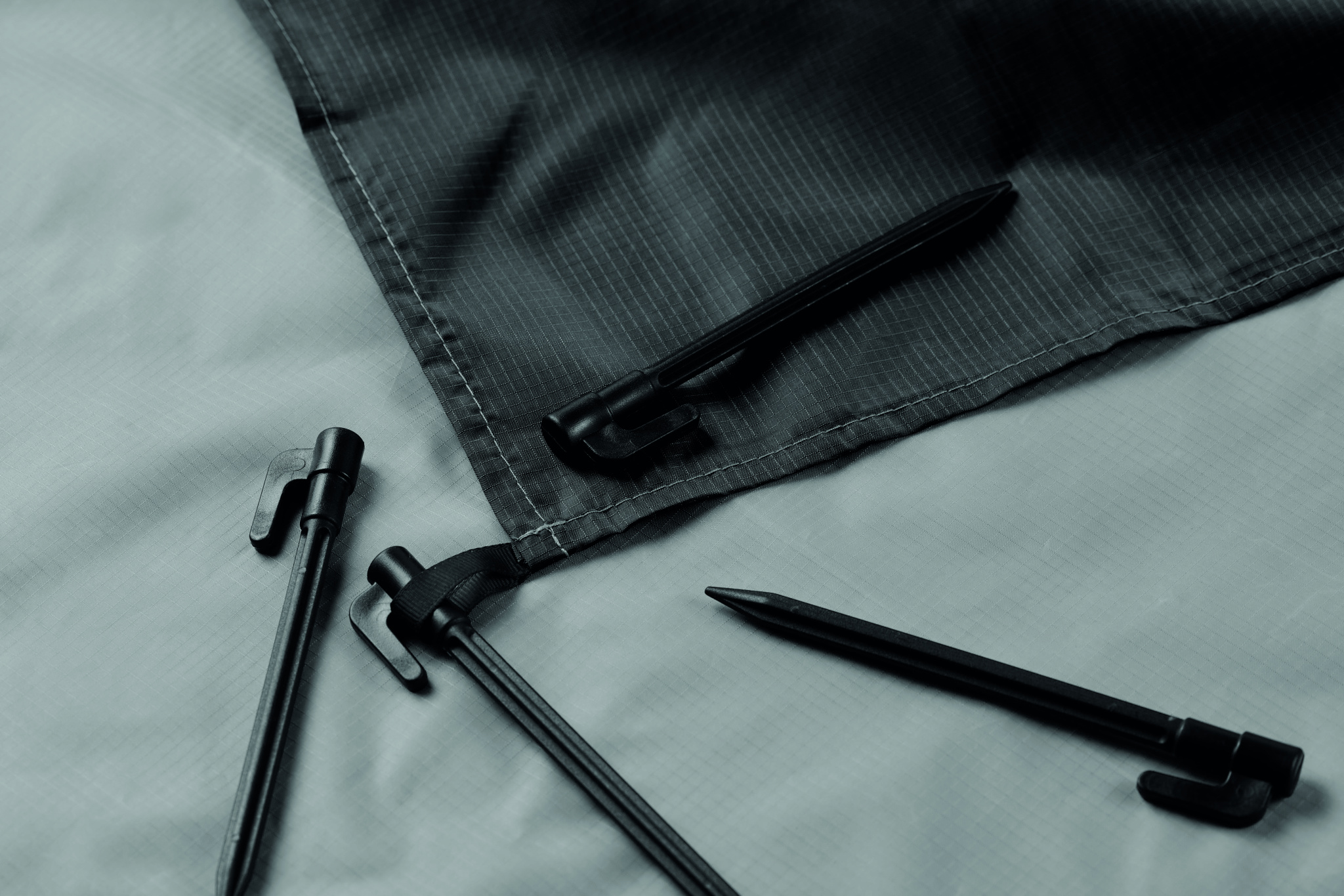 Kevyt rantamatto 210T polyesteristä, mitat 200 x 210 cm. Mukana neljä mustaa koukkua ja yhteensopiva kiristysnyörillä varustettu pussi helppoa kantamista varten.