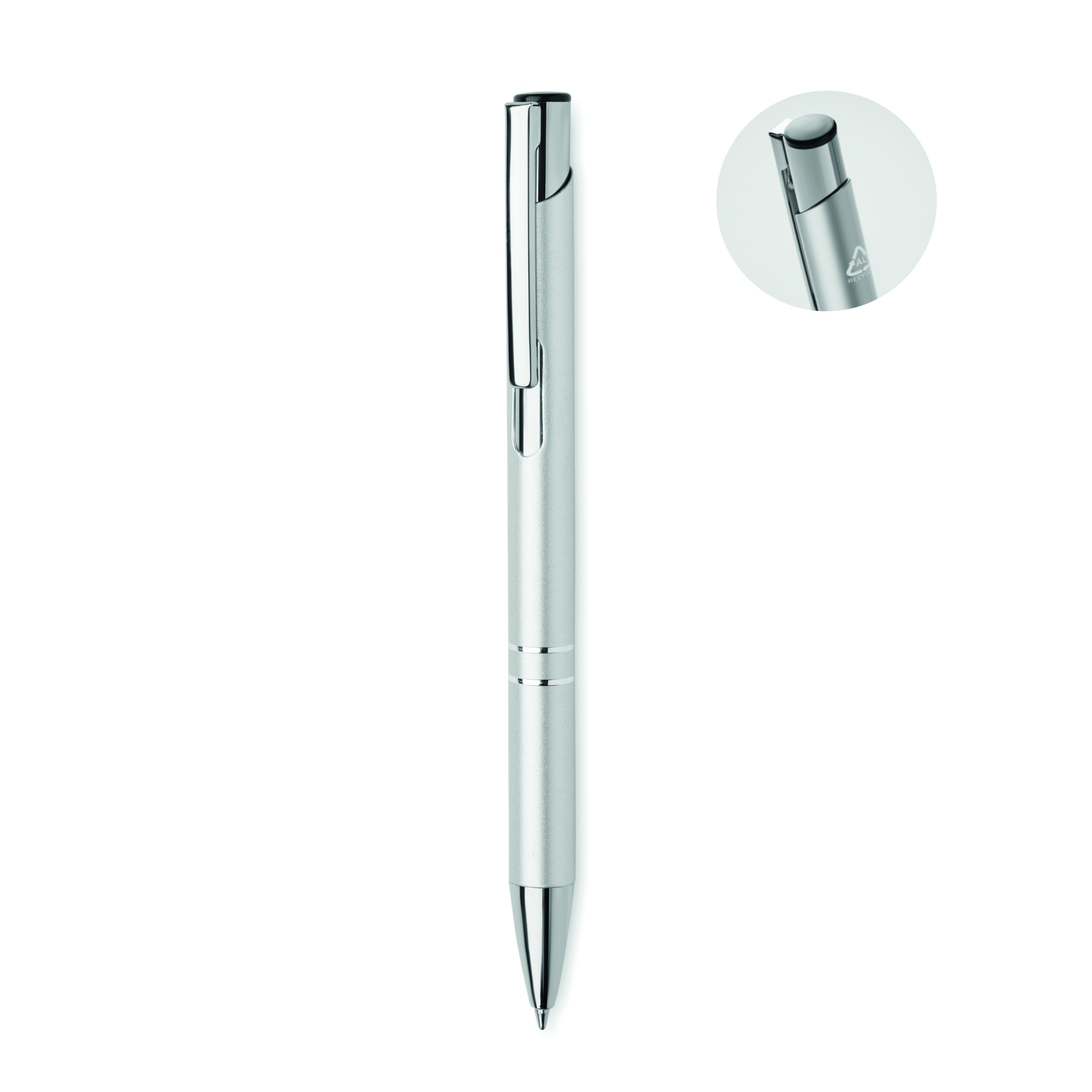 Kierrätetystä alumiinista valmistettu painomekanismilla toimiva kuulakärkikynä sinisellä musteella.