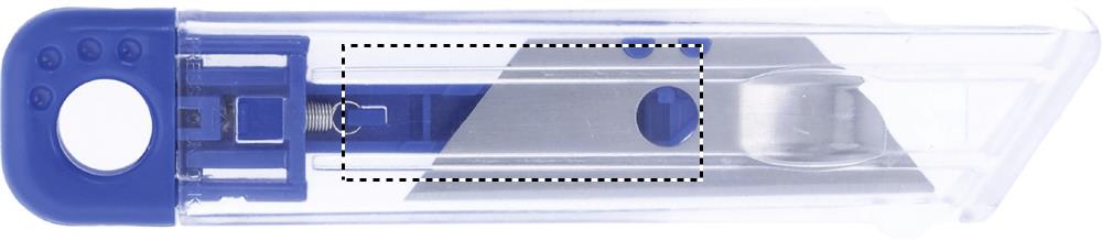 Uudelleen sisäänvedettävä mattoveitsi. Läpinäkyvä runko ja värikkäät yksityiskohdat.