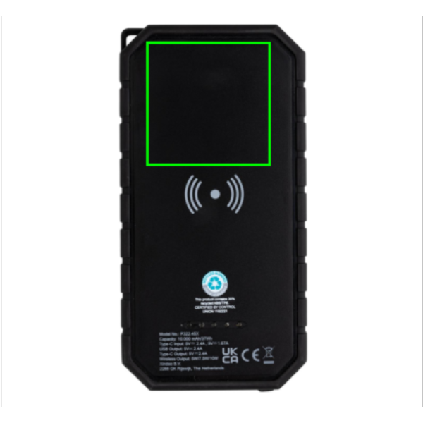Nopea 10000mAh 10W langaton varavirtalähde, joka on valmistettu RCS (Recycled Claim Standard) -sertifioidusta kierrätetystä ABS-materiaalista ja TPE:stä. Kierrätetyn materiaalin kokonaismäärä: 30% perustuen tuotteen painoon. RCS sertifiointi varmistaa kierrätettyjen materiaalien täysin sertifioidun toimitusketjun. Varavirtalähde tukee sekä kaapelilatausta (tyyppi C ja USB) sekä 10W langatonta pikalatausta. Langaton lataus toimii kaikkien QI-yhteensopivien, kuten Androidin uusimpien sukupolvien, iPhone 8 ja uudempien, tuotteiden kanssa. Tuotteessa on aurinkopaneeli, taskulamppu sekä klipsi. IPX5 vedenkestävä. Virran merkkivaloilla. Sisältää tyypin C latauskaapelin, joka on valmistettu GRS-sertifioidusta kierrätetystä TPE:stä. Pakattu FSC® sekoituksesta valmistettuun kraft-pakkaukseen. USB lähtövirta: 5V/2.4A, tyypin C lähtövirta: 5V/2.4A. Tuote ja lisätarvikkeet 100% PVC-vapaita.