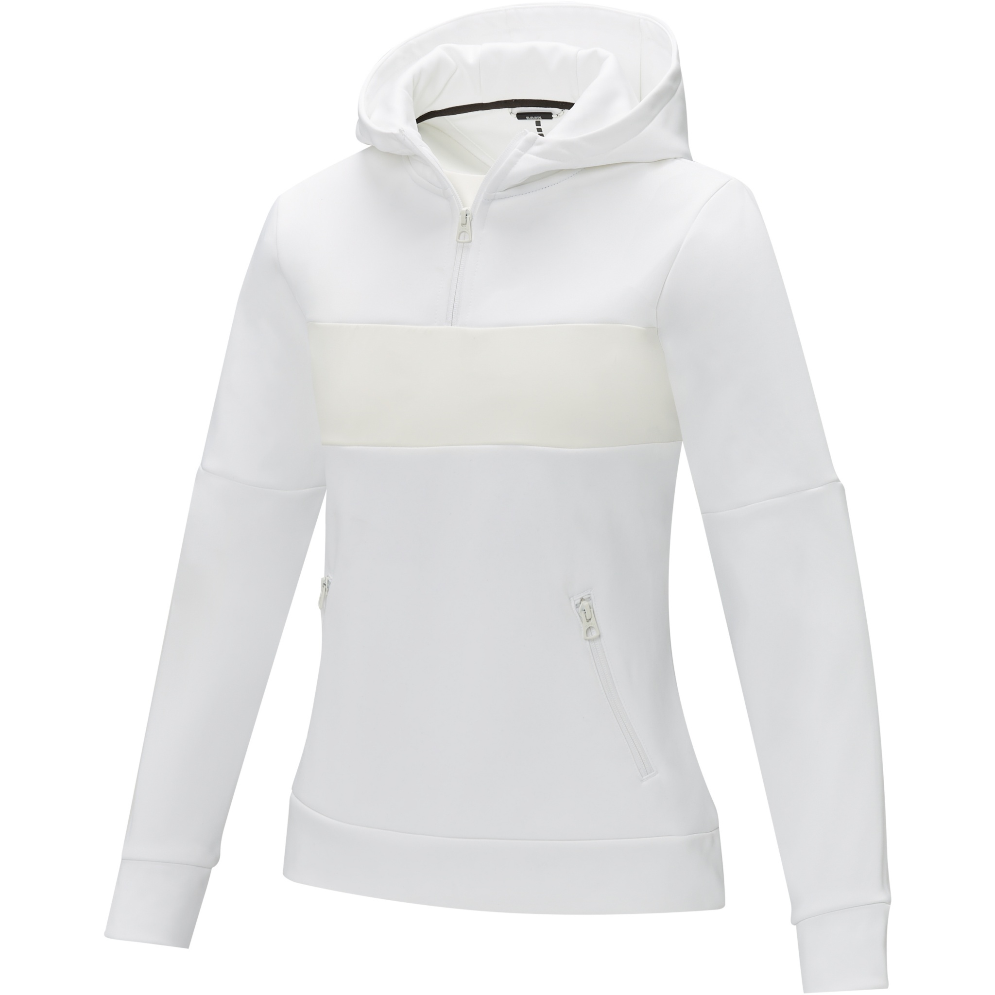 Naisten puolivetoketjullinen anorakkihupullinen Sayan-svetari – ainutlaatuinen yhdistelmä suorituskykyä ja tyyliä. Anorakkimuotoilussa yhdistyvät muoti ja toiminnallisuus, ja siinä on neljännesvetoketju, joka mahdollistaa monipuolisen kerrospukeutumisen. Valmistettu 350 g/m²:n polyesterin ja Sorona®-neuloksen sekoituksesta. Sorona®-kuitu tekee takista ympäristöystävällisen vaihtoehdon lisäämällä siihen kestävän kehityksen mukaisen elementin suorituskyvystä tinkimättä. 280T ripstop-nailonista valmistettu etupaneelin kontrastikangas täydentää takkia kestävyydellään ja tekstuurillaan ja on ihanteellinen paikka esitellä tuotemerkkiäsi. Olitpa sitten lähdössä seikkailemaan luontoon tai vain suorittamassa arkirutiinejasi, hupullisessa Sayan-svetarissa yhdistyvät vaivattomasti muoti ja toiminnallisuus. Tämä svetari myötäilee vartaloa, mikä antaa sille naisellisen ilmeen.