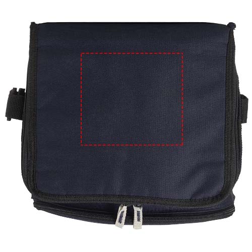 Taitettava kylmälaukku, jossa on vetoketjullinen etutasku. Säädettävä olkahihna. Kymälaukun saa litteäksi etutaskun velcro-tarranauhan avulla. Tarvikkeet rekvisiittaa.