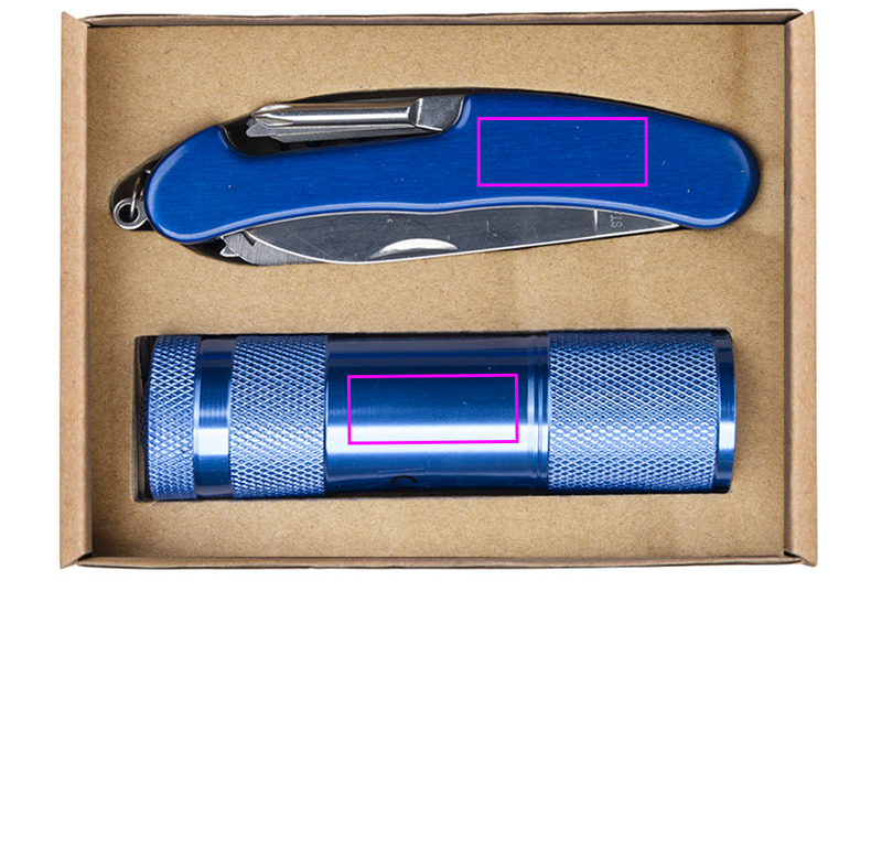 Setti, joka sisältää alumiinisen taskulampun yhdeksällä LEDillä ja taskuveitsen. Laseroimme logosi taskulampussa ja taskuveitsessä samankokoisina. Mukana kolme AAA-paristoa.