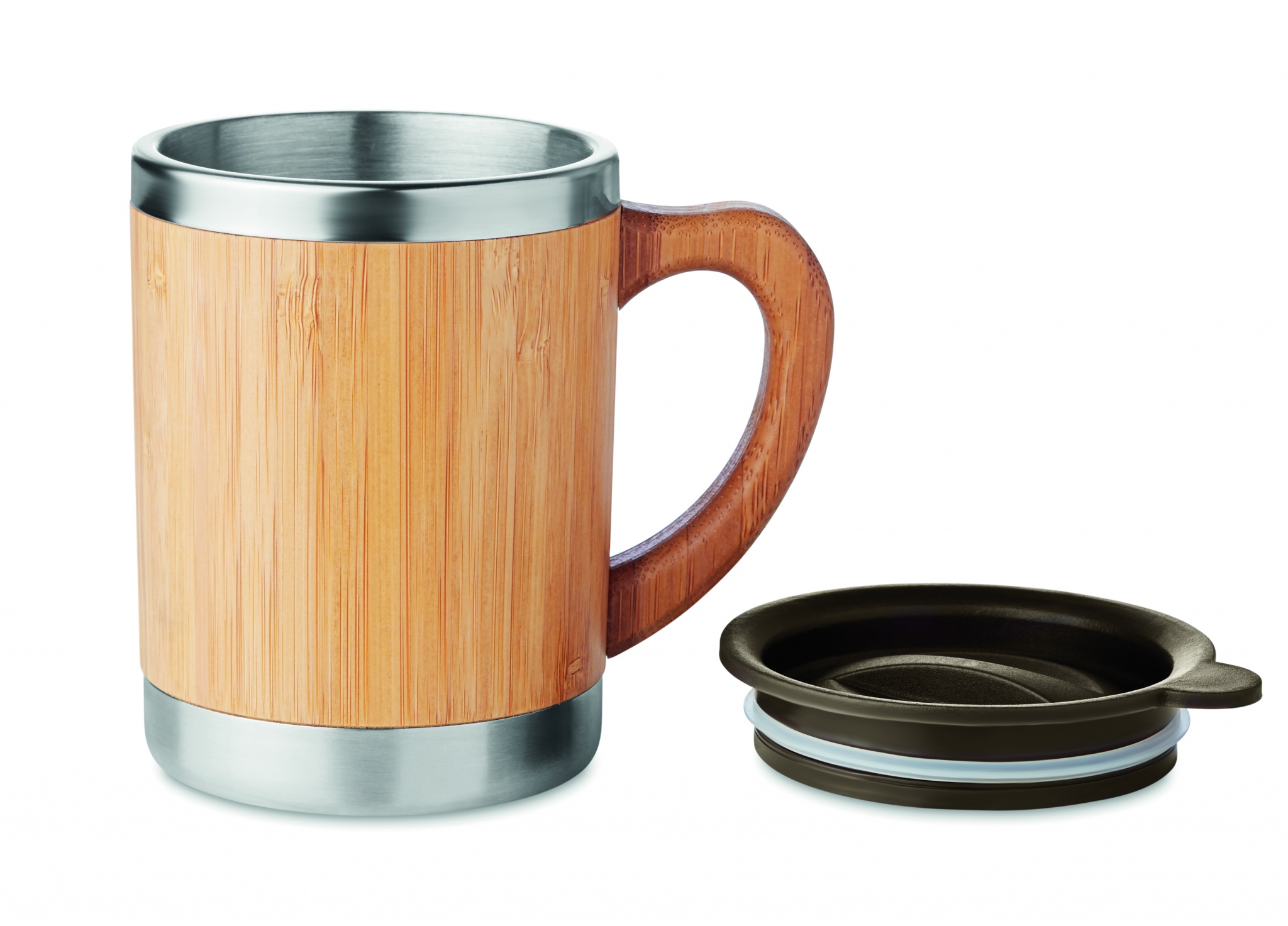 Kaksoisseinämällä ruostumaton terästermosmuki, jossa bambukuori ja liikutettava juoma-aukko. Tilavuus 300 ml. Koska bambu on luonnollinen materiaali, tuotteen väri voi vaihdella.
