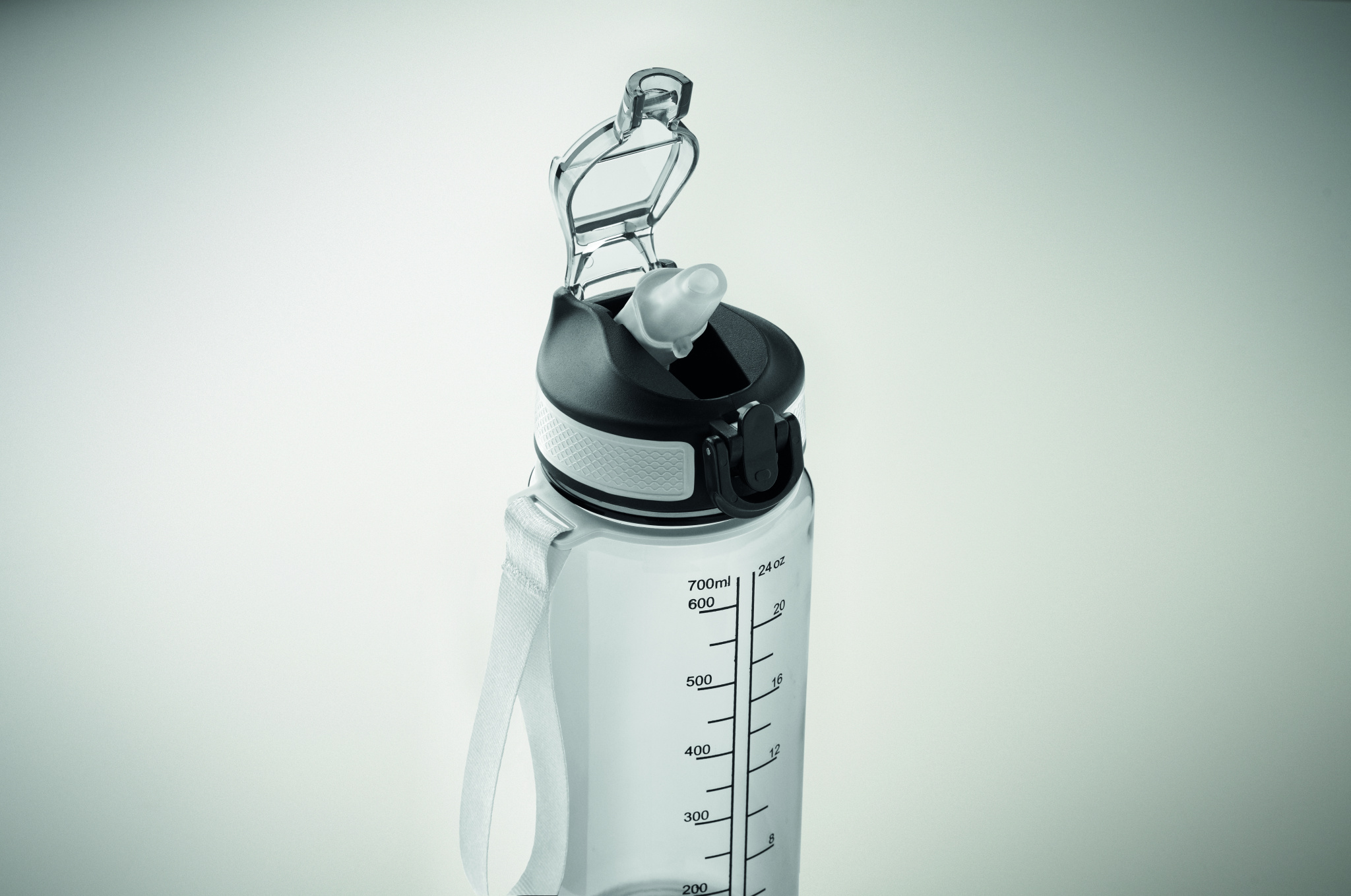 Motivoiva vesipullo RPET-muovista, jossa on integroitu pilli, pehmeä silikoninen suukappale, yhdellä kädellä avattava fliptop-kansi, turvalukko. Hihna RPET-satiinista. Tilavuus 700 ml. Vuotamaton.