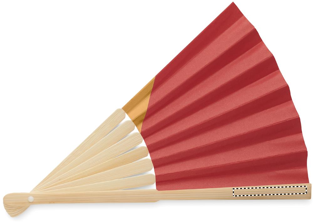 Käsikäyttöinen bambusta valmistettu viuhka, jossa on lippukuvio paperikankaalla.