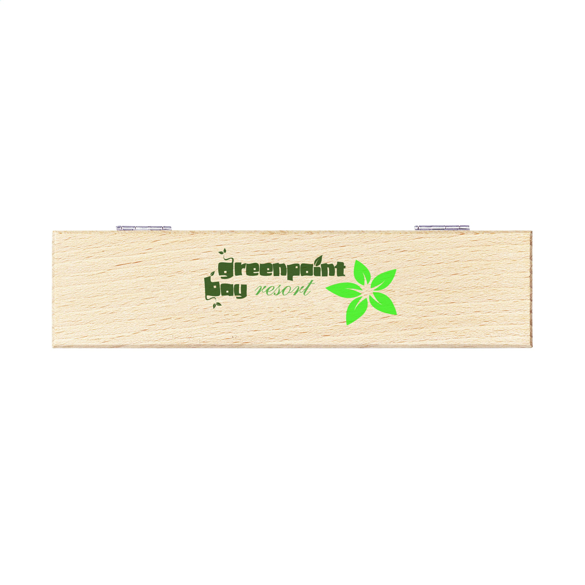 Oho! Buko medžio rašymo rinkinys: mėlyno rašalo tušinukas ir pakartotinai užpildomas pieštukas su 3 HB užpildais (0,5 mm). Su chromuotu segtuku, mygtuku ir tašku. Paplūdimio medinėje dėžutėje.