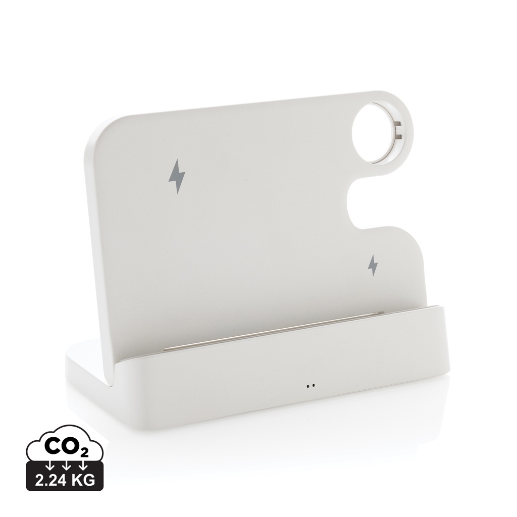 Salokāms dizaina uzlādes statīvs ar 15 W bezvadu lādētāju, kas izgatavots no pārstrādāta ABS. Ar otro 5 W bezvadu lādētāju, lai uzlādētu mazākus priekšmetus, piemēram, austiņas. Ar iWatch slotu, kas piemērots oficiālajam iWatch uzlādes kabelim. Aizmugurē ir 5V/1A USB A un USB C izejas ports, lai uzlādētu priekšmetus, izmantojot kabeli. Ar silīcija uzgaļiem apakšā, lai izvairītos no slīdēšanas, un silīcija amortizāciju pie statīva, lai tālrunis būtu ideālā stāvoklī. Kopējais pārstrādātais saturs: 80% no kopējā preces svara. RCS sertifikācija nodrošina pilnībā sertificētu pārstrādāto materiālu piegādes ķēdi. Iepakots FSC® iepakojumā. Bez PVC. Ietver RCS pārstrādātu TPE 120 cm USB A–USB C uzlādes kabeli. Iepakots FSC® iepakojumā. Bez PVC