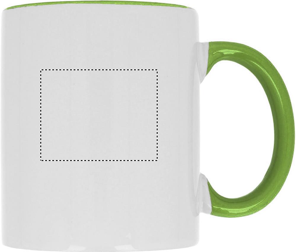Keramikas krūze ar ietilpību 300 ml ar speciālu pārklājumu sublimācijai ar krāsainu rokturi un iekšpusi. Individuāls iepakojums baltā kartona kastē.