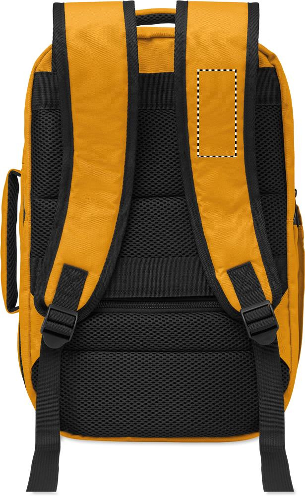 Cabin-size carry-on extendable backpack made of 600D RPET polyester with 180o opening. Features a main compartment with two open sections, mesh division, padded 15'' laptop pocket, and luggage strap.