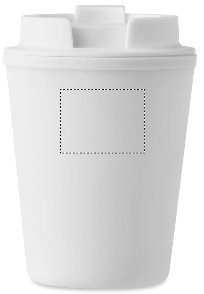 Dubbelväggsbägare med lock i återvunnen PP. Volym: 300 ml.
