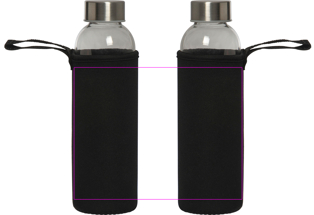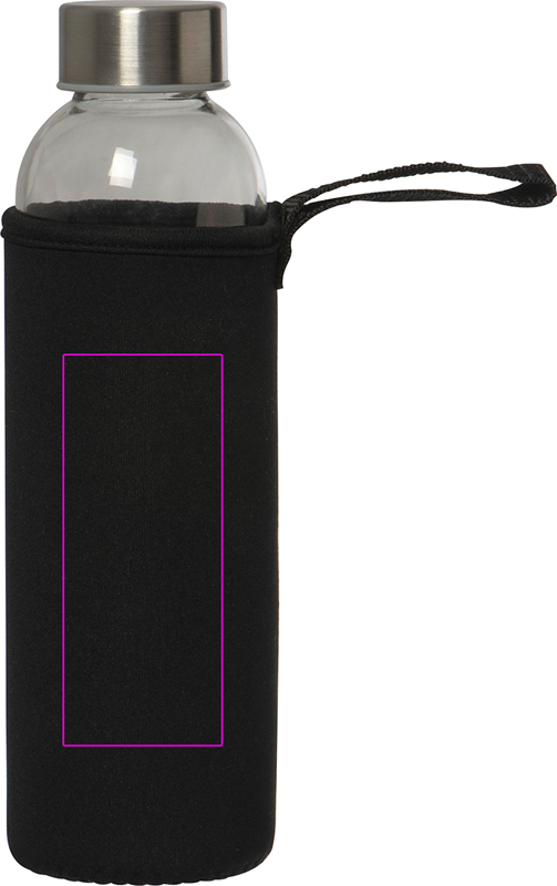 Läcksäker dricksflaska av glas med lock i rostfritt stål och en kapacitet på 500 ml. Flaskan levereras i matchande neoprenfodral med bärrem. Vi trycker din logotyp i mitten av ärmen. Gravering på locket eller flaskan och tryck på flaskan möjlig på begäran.