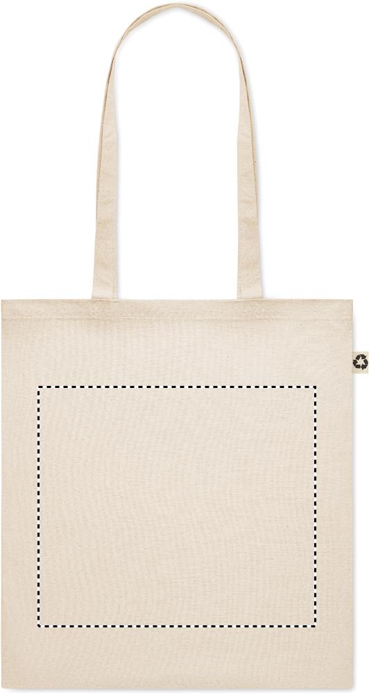 Kasse i återvunnen bomull (65 % återvunnen bomull, 35 % vanlig bomull) med långa handtag. 140 gr/m².