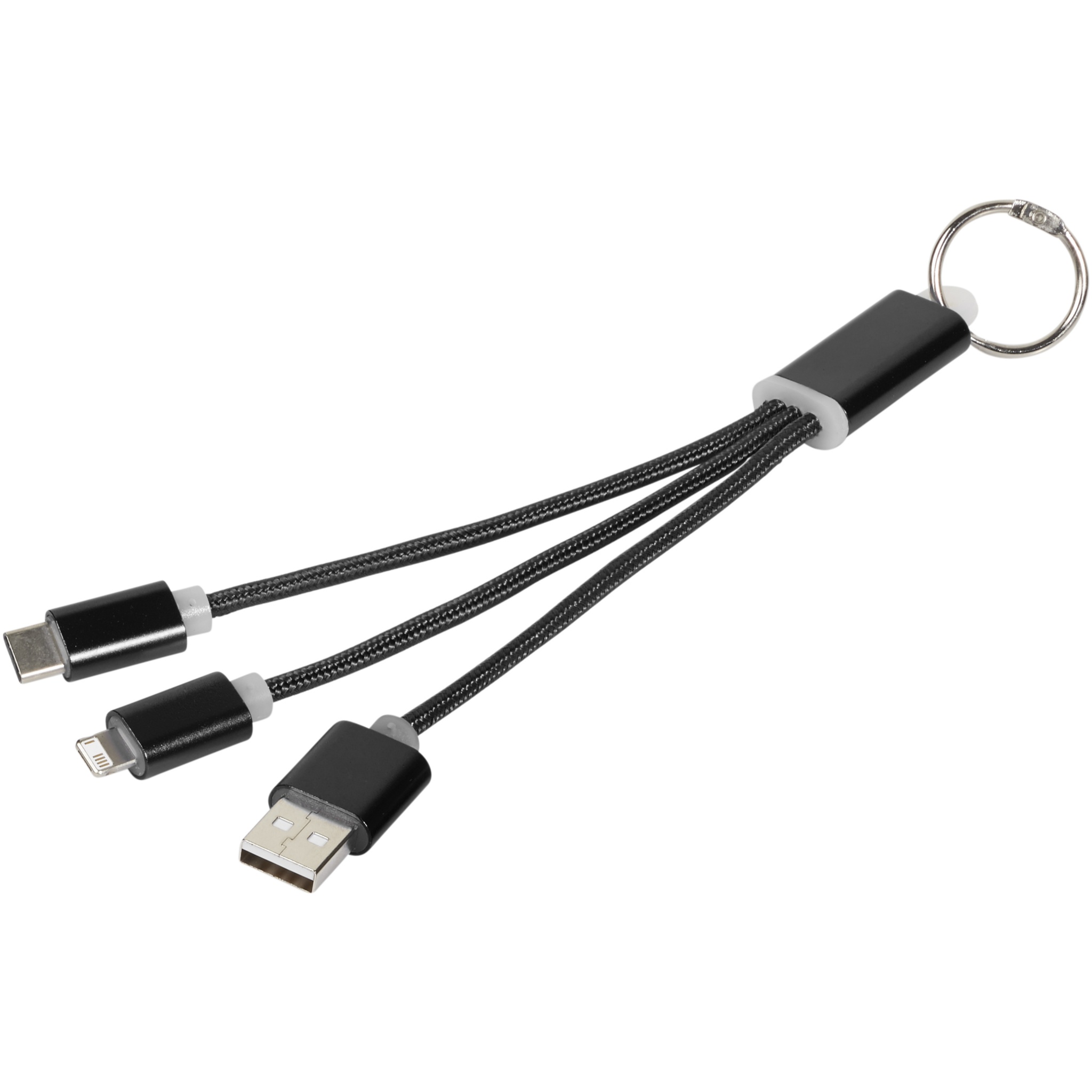 Metal 3-i-1 laddningskabel med nyckelring. 3-i-1 laddningskabel med nyckelring. 3-i-1 laddningskabeln med nyckelring har en 1 C, 1 USB typ A och en 2-i-1 kompatibel dubbelport för både Apple iOS och Android-enheter. Kommer med en nyckelring. För att ladda Apple-enheter sätter du i kabeln, med den sida som är utan stift, i enheten och för att ladda Android-enheter sätter du i kabeln med den sida som har stift. Aluminium.