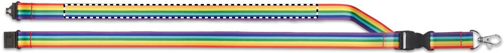 Regnbågsfärgad logoband Pride i RPET med metallkrok, snabbfäste och säkerhetsklips.