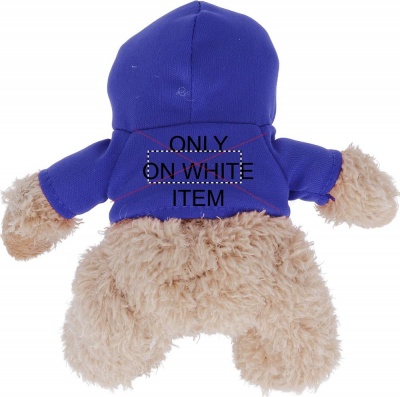 Teddybjörn i plysch. Klädd i en tryckbar huvtröja. Sublimeringstryck endast på vit produkt.