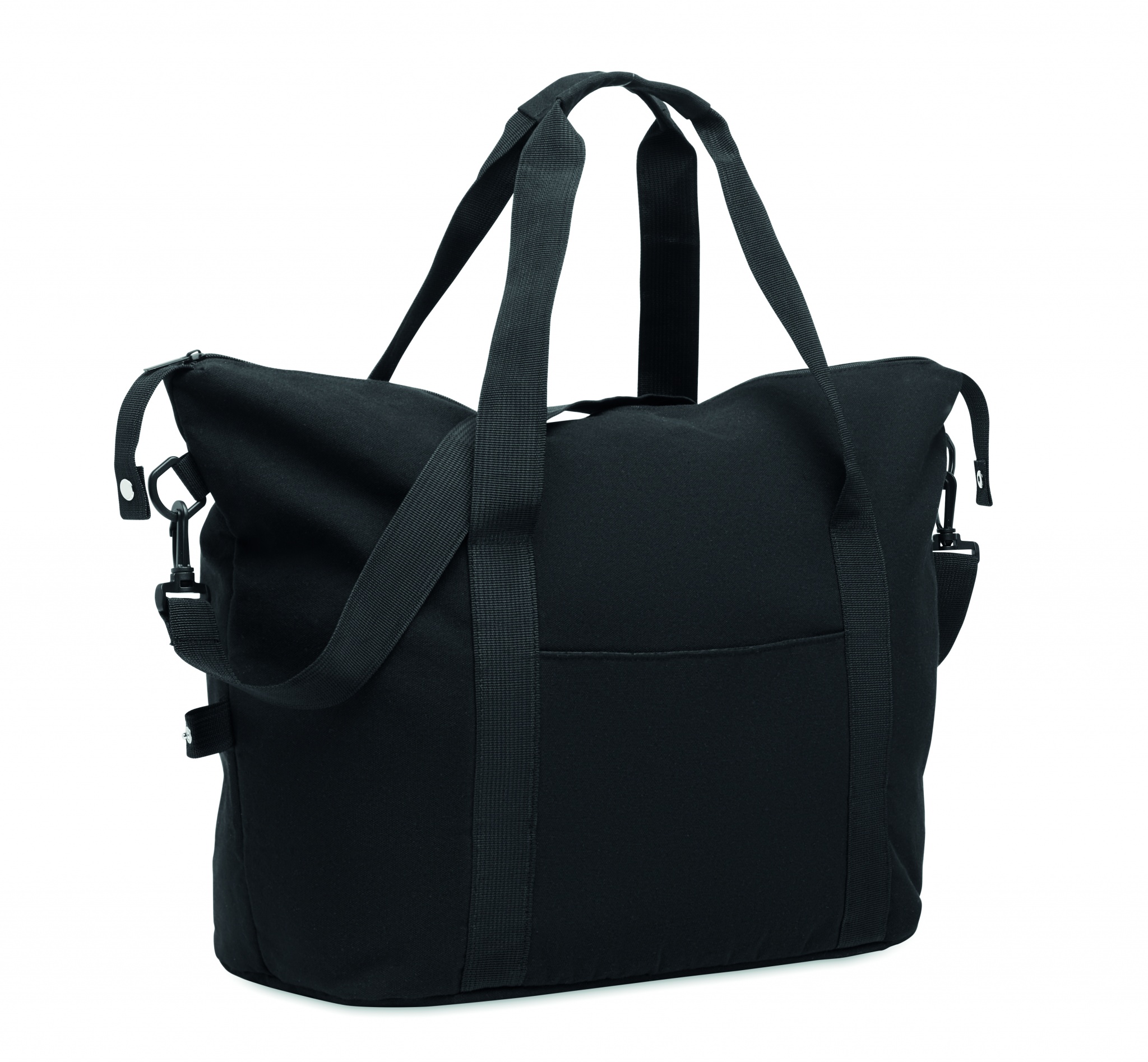 Weekendbag i återvunnen bomull och återvunnen polyester (70%/30%) med foder i 210D RPET-polyester. Den har en ficka framtill, en bakficka med dragkedja, en avtagbar och justerbar axelrem och vadderad botten. Trolleyhållare på baksidan.